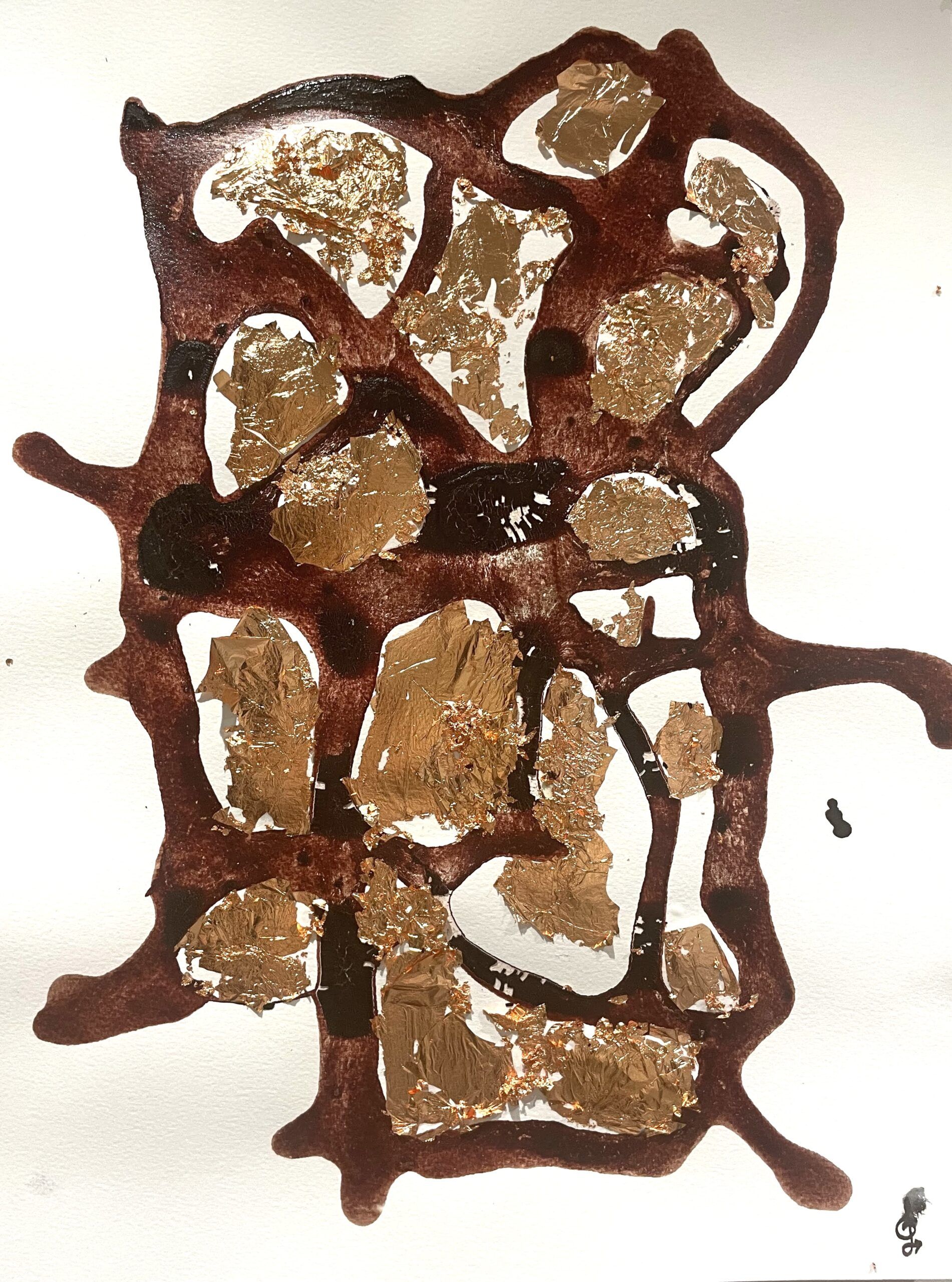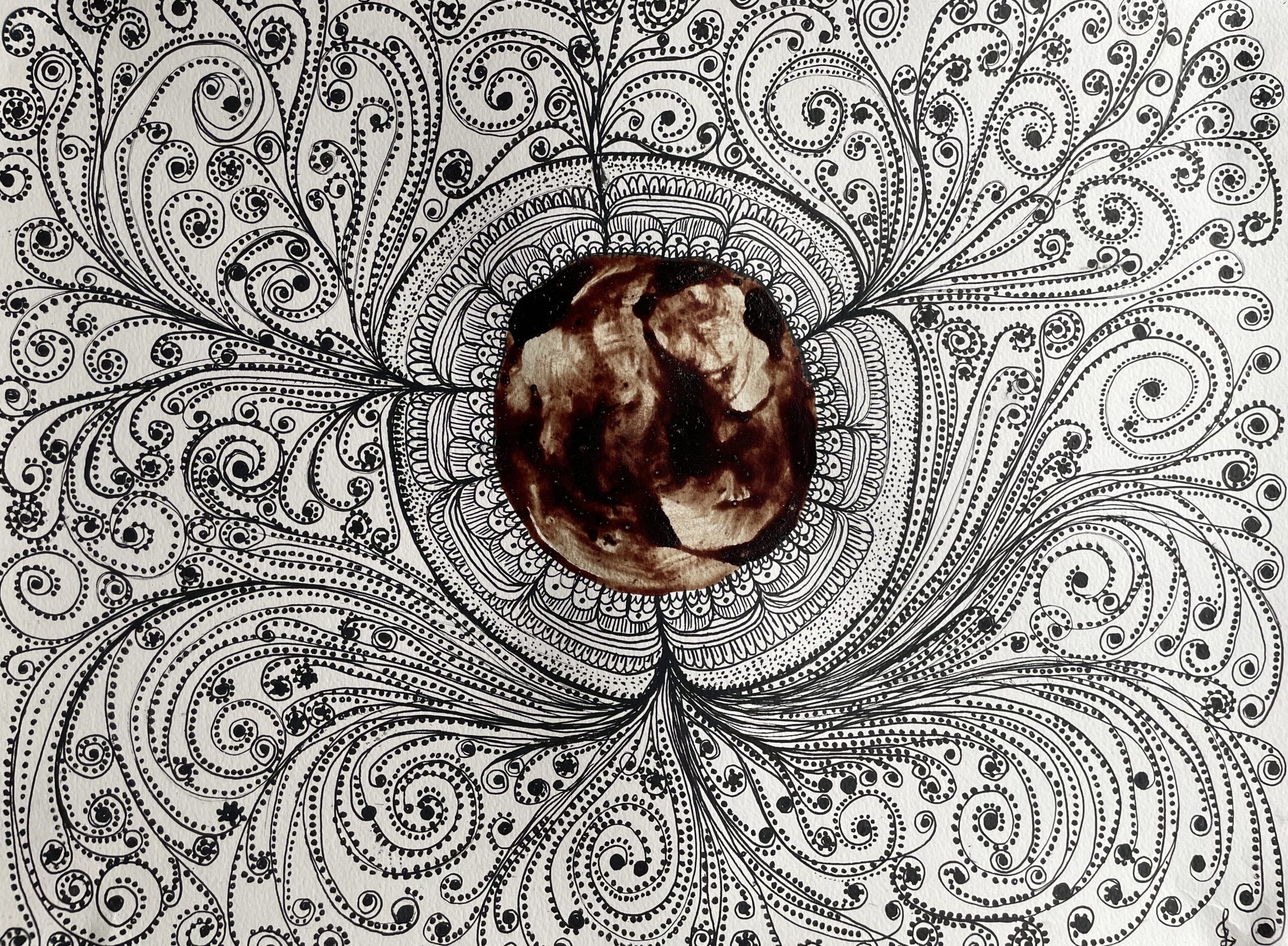 El cabello, representado con una rica gama de tonos marrones, dorados y grises, fluye como símbolo de la sabiduría, el tiempo y las raíces. A medida que los trazos avanzan, las formas se transforman revelando un universo íntimo y sagrado, evocando el portal creador de la vida.